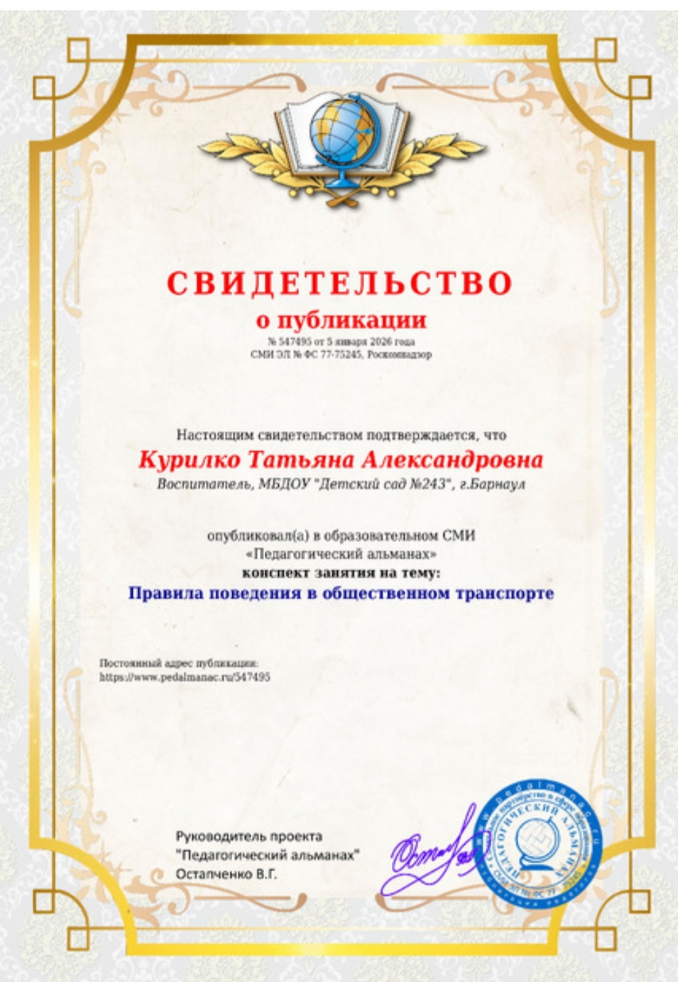 Воспитатель Курилко Татьяна Александровна